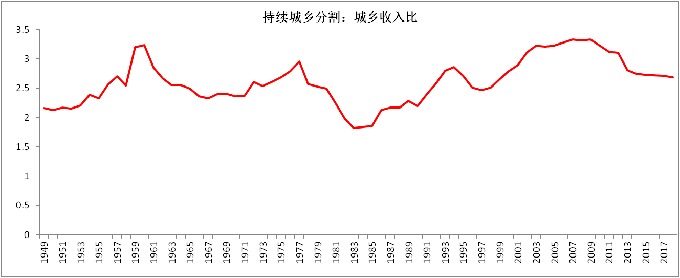 資料來源:其中1949-1956年城鄉(xiāng)居民收入數(shù)據(jù)來自于消費(fèi)數(shù)據(jù),1957-1977年數(shù)據(jù)來自于《新中國(guó)六十年年統(tǒng)計(jì)資料匯編》,1978-2018年數(shù)據(jù)來自于《中國(guó)統(tǒng)計(jì)鑒》。
