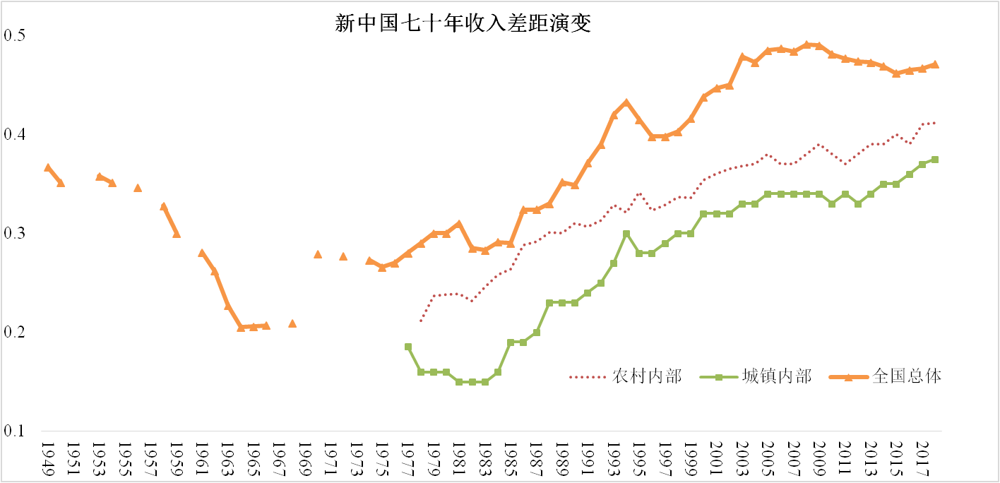 資料來源:全國(guó)基尼系數(shù)來自于世界銀行(1981-2001),收入分配課題組(2002)和國(guó)家統(tǒng)計(jì)局(2003-2017)的估計(jì)結(jié)果。農(nóng)村和城鎮(zhèn)的基尼系數(shù)來自于歷年的“中國(guó)居民收入分配年度報(bào)告”。2012-2017年農(nóng)村及2011-2017年城鎮(zhèn)內(nèi)部數(shù)據(jù)來自于省份加權(quán)計(jì)算結(jié)果。1978-1980年全國(guó)基尼系數(shù)來自于省份加權(quán)并調(diào)整的結(jié)果。1949-1977年全國(guó)總體、城鎮(zhèn)內(nèi)部、農(nóng)村內(nèi)部差距,都來自于UNU-WIDER數(shù)據(jù)庫。