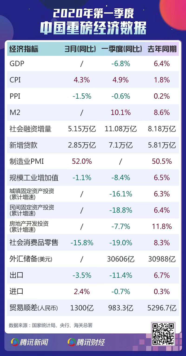 4月17日,國(guó)新辦就2020年一季度國(guó)民經(jīng)濟(jì)運(yùn)行情況舉行新聞發(fā)布會(huì)。國(guó)家統(tǒng)計(jì)局新聞發(fā)言人毛盛勇介紹,初步核算,一季度國(guó)內(nèi)生產(chǎn)總值206504億元,按可比價(jià)格計(jì)算,同比下降6.8%。