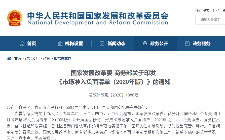 國(guó)家發(fā)展改革委新聞發(fā)言人孟瑋表示,從2018年12月正式發(fā)布全國(guó)統(tǒng)一的市場(chǎng)準(zhǔn)入負(fù)面清單以來(lái),通過(guò)三年落地實(shí)施,已經(jīng)實(shí)現(xiàn)了在全國(guó)范圍確立了市場(chǎng)準(zhǔn)入環(huán)節(jié)的負(fù)面清單管理模式。清單之外的行業(yè)、領(lǐng)域、業(yè)務(wù)等,市場(chǎng)主體可以依法平等進(jìn)入,實(shí)現(xiàn)“非禁即入”。