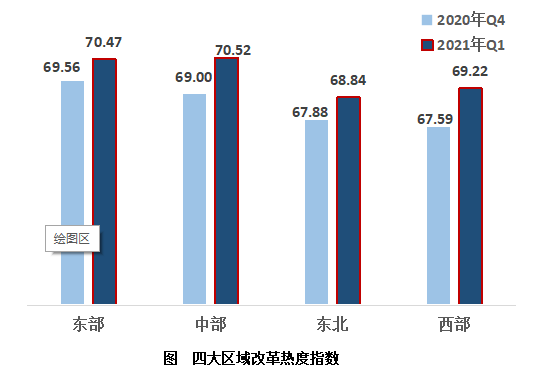 2、中西部地區(qū)引領(lǐng)指數(shù)回升趨勢(shì)。從四大區(qū)域來看,東部、中部、東北、西部的改革熱度指數(shù)分別為70.47,70.52,68.84,69.22;中、西部地區(qū)指數(shù)增幅超越東部。從排名來看,中部地區(qū)超越東部地區(qū),名列第一;西部地區(qū)小幅超越東北地區(qū)位居第三,東北地區(qū)墊底。