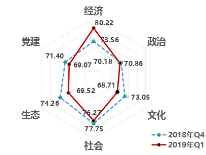 2.從領(lǐng)域來看,經(jīng)濟(jì)領(lǐng)域改革熱度一直較高。經(jīng)濟(jì)80.22,政治70.18,文化68.71,社會76.27,生態(tài)69.52,黨建69.07。六大領(lǐng)域除經(jīng)濟(jì)領(lǐng)域外,政治、文化、社會、生態(tài)、黨建領(lǐng)域均比2018年第4季度有所下降,其中生態(tài)領(lǐng)域下降4.73,降幅6.37%。從連續(xù)八個季度評估結(jié)果來看,相對其它領(lǐng)域,經(jīng)濟(jì)領(lǐng)域改革熱度指數(shù)處于高位,社會領(lǐng)域次之,文化領(lǐng)域的改革熱度指數(shù)低位運行。