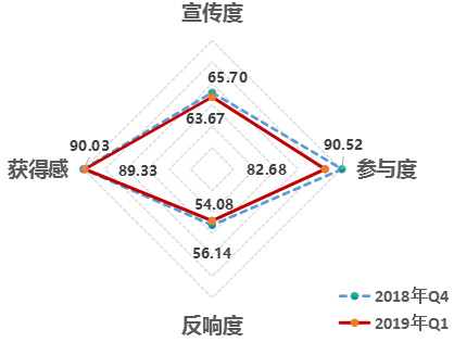 3.從維度來看,反響度呈現(xiàn)上升趨勢。宣傳度63.67,參與度82.68,反響度54.08,獲得感89.33。2019年第1季度,四大維度均比2018年第4季度有所下滑,其中參與度下降達(dá)7.84。從連續(xù)八個季度評估結(jié)果來看,反響度在穩(wěn)步提升,說明公眾在積極主動關(guān)注、討論各項改革。