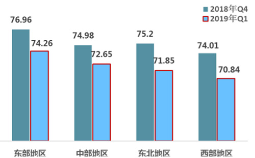 1.從區(qū)域來看,東部地區(qū)高于西部地區(qū)。一季度東部、中部、東北、西部的改革熱度指數(shù)分別為74.26、72.65、71.85、70.84,比2018年第4季度均有所下降。其中,東北地區(qū)的降幅最大,達(dá)到4.45%。從連續(xù)八個季度評估結(jié)果來看,改革熱度指數(shù)呈現(xiàn)出地域特征,東部地區(qū)最高,西部地區(qū)最低,兩者之間的差距呈現(xiàn)不斷縮小的趨勢。