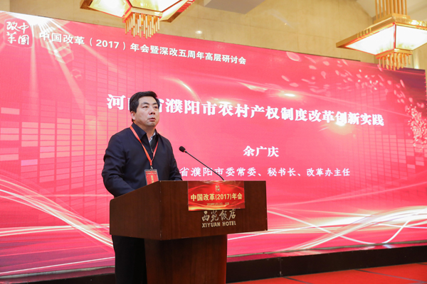 河南省濮陽(yáng)市委常委、秘書長(zhǎng)、改革辦主任余廣慶介紹了濮陽(yáng)特色鮮明的農(nóng)村集體產(chǎn)權(quán)制度改革經(jīng)驗(yàn):在推進(jìn)農(nóng)村集體產(chǎn)權(quán)制度改革中,濮陽(yáng)市農(nóng)村黨支部成為基層黨建工作的一個(gè)重大創(chuàng)新,市委領(lǐng)導(dǎo)親自上陣親自督辦、跟蹤進(jìn)度;建成了比較完善的市縣鄉(xiāng)三級(jí)產(chǎn)權(quán)交易平臺(tái),充分釋放農(nóng)村要素活力;依托市縣兩級(jí)黨校邀請(qǐng)專家解讀改革政策改革事件推動(dòng)農(nóng)村改革。