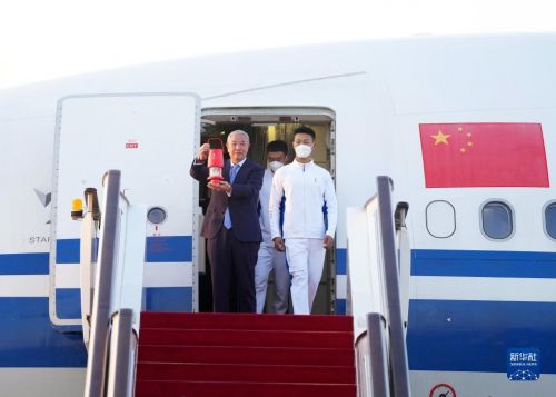 10月20日,在北京首都機場,北京冬奧組委特別代表、北京冬奧組委副主席于再清(左)手持火種燈走出艙門。隨著北京冬奧組委赴希臘代表團(tuán)抵達(dá)首都機場,北京冬奧會火種順利抵達(dá)北京。新華社記者 張晨霖 攝