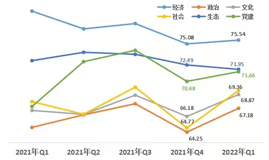 1、從領(lǐng)域來看,經(jīng)濟(jì)領(lǐng)域增幅低于其他領(lǐng)域。第一季度,經(jīng)濟(jì)領(lǐng)域得分75.54,政治領(lǐng)域得分67.18 ,文化領(lǐng)域得分68.87,社會領(lǐng)域得分69.36,生態(tài)領(lǐng)域得分71.95,黨建領(lǐng)域得分71.66。與上一季度相比,生態(tài)領(lǐng)域小幅下降,其他五個(gè)領(lǐng)域均上升。其中社會領(lǐng)域升幅最大,政治領(lǐng)域次之,經(jīng)濟(jì)領(lǐng)域提升最小。