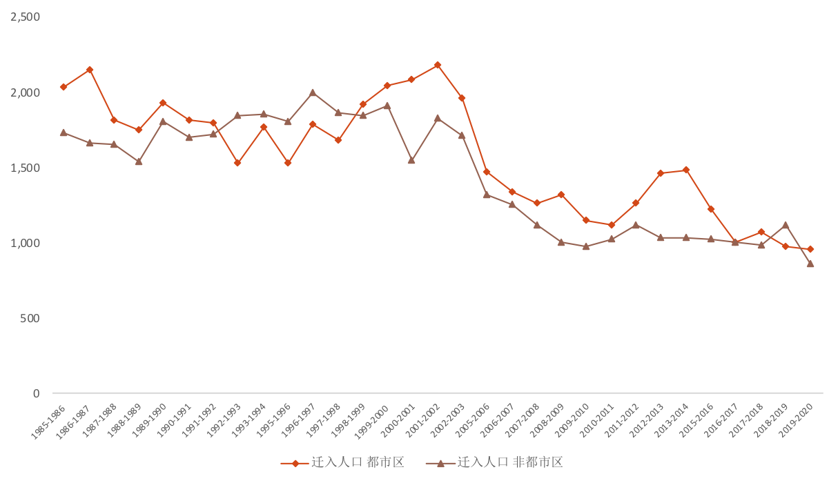圖3:美國(guó)城鄉(xiāng)融合的表現(xiàn)-非都市區(qū)的人口遷入量與都市區(qū)人口遷入量趨同
