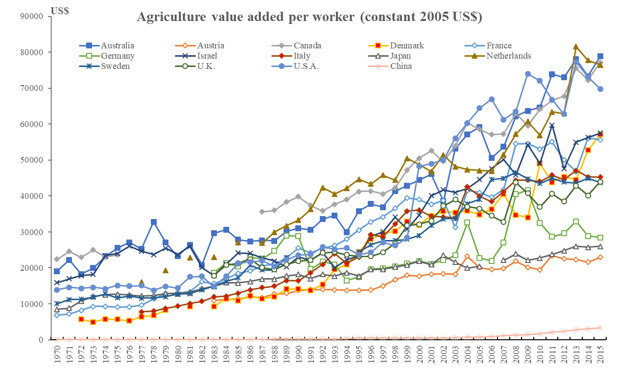 如圖5,西方城市化過程中兩個(gè)收入差距的縮小在中國(guó)沒有出現(xiàn)。中國(guó)在最快速城市化階段出現(xiàn)了城鄉(xiāng)收入差距拉大,第一是我們只有快速城市化,但沒有城鄉(xiāng)融合。第二是我們城市化的模式是回村的城市化模式。在城市里干工作,干到一定程度再回到農(nóng)村,這是全世界沒有的。第三是農(nóng)業(yè)競(jìng)爭(zhēng)力下降?,F(xiàn)在一定要有一個(gè)認(rèn)識(shí),農(nóng)業(yè)的份額降到10%以后,各個(gè)國(guó)家的農(nóng)業(yè)到底在干什么?我們現(xiàn)在想到農(nóng)業(yè)到10%,再到2%、1%,農(nóng)業(yè)就可有可無(wú)了,這種觀點(diǎn)是錯(cuò)誤的。所有國(guó)家的農(nóng)業(yè)在降到10%以后,農(nóng)業(yè)在變強(qiáng),它的農(nóng)業(yè)和原來的農(nóng)業(yè)完全不一樣。中國(guó)由于單向城市化的模式,最后農(nóng)業(yè)競(jìng)爭(zhēng)力進(jìn)一步下降。(如圖6)我們現(xiàn)在只有6%、7%的農(nóng)業(yè),這個(gè)農(nóng)業(yè)的競(jìng)爭(zhēng)力是下降的,背后是農(nóng)業(yè)成本上升,所有成本都在上升。