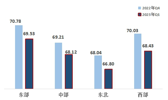 2、中部地區(qū)落后于西部地區(qū)。東部、西部、中部、東北地區(qū)指數(shù)分別為69.53、68.43、68.12、66.80。東部地區(qū)領(lǐng)先,西部地區(qū)排名第二,連續(xù)四個(gè)季度超越中部地區(qū),東北地區(qū)最后。與上一季度相比,四大區(qū)域均有下滑,東北地區(qū)降幅較大。
