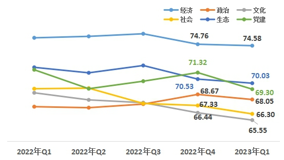 1、經(jīng)濟(jì)、生態(tài)領(lǐng)域小幅下降。從六大領(lǐng)域來看,經(jīng)濟(jì)領(lǐng)域74.58,政治領(lǐng)域68.05,文化領(lǐng)域65.55,社會(huì)領(lǐng)域66.30,生態(tài)領(lǐng)域70.03,黨建領(lǐng)域69.30。與上一季度相比,六大領(lǐng)域均有小幅下降;與去年一季度相比,政治領(lǐng)域同比上升,其他領(lǐng)域同比小幅下降。