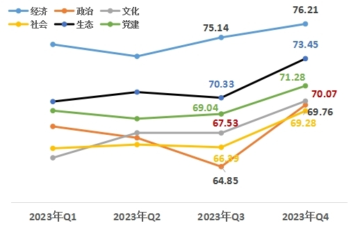 從改革熱度指數(shù)的六大領(lǐng)域來看,經(jīng)濟(jì)領(lǐng)域76.21,政治領(lǐng)域69.76,文化領(lǐng)域70.07,社會(huì)領(lǐng)域69.28,生態(tài)領(lǐng)域73.45,黨建領(lǐng)域71.28。與上一季度相比,六大領(lǐng)域均有上升,政治領(lǐng)域升幅最高,經(jīng)濟(jì)領(lǐng)域升幅最低。