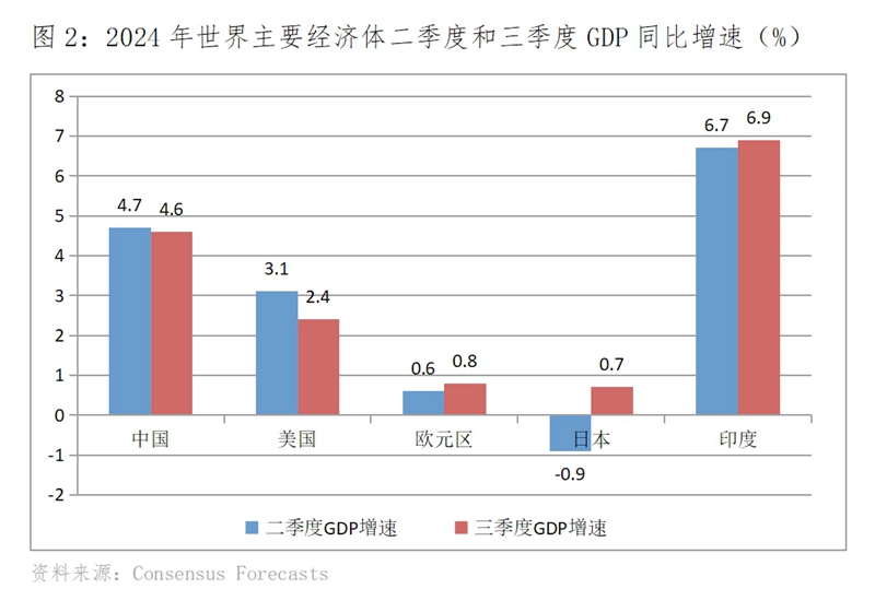 Consensus Forecasts 9月份最新預(yù)測,世界主要經(jīng)濟(jì)體GDP增速有升有落,呈現(xiàn)出走勢分化的特征。三季度美國GDP同比增長2.4%,比二季度增長3.1%回落0.7個百分點(diǎn);歐元區(qū)增長0.8%,比二季度增長0.6%回升0.2個百分點(diǎn);日本增長0.7%,二季度下降0.9%,增速由負(fù)轉(zhuǎn)正;印度增長6.9%,比二季度增長6.7%回升0.2個百分點(diǎn)。