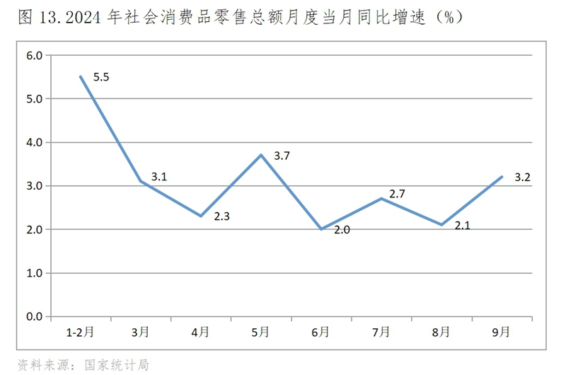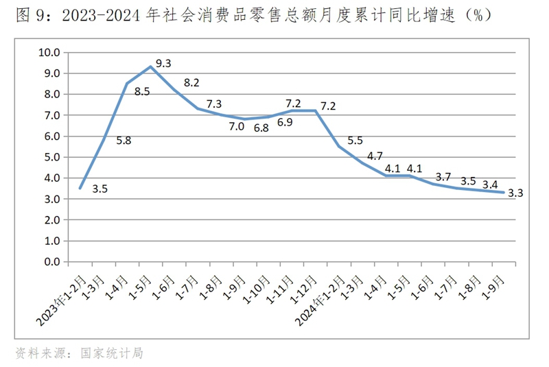 (三)零售增速總體呈現(xiàn)低速波動回落,9月份回升。1-2月份社會消費(fèi)品零售總額同比增長5.5%,為今年以來的最快增速,3月份回落到增長3.1%,此后增速在2.0-4.0%區(qū)間內(nèi)低速波動,9月份增速回升,增長3.2%。