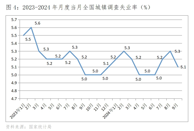 (三)調(diào)查失業(yè)率比上年同期略升,比6月份也略升。9月份城鎮(zhèn)調(diào)查失業(yè)率為5.1%,比上年同期的5.0%回升了0.1個百分點(diǎn),比6月份的5.0%也回升了0.1個百分點(diǎn)。從結(jié)構(gòu)上看,青年調(diào)查失業(yè)率還保持在較高水平,8月份全國城鎮(zhèn)不包含在校生的16-24歲的調(diào)查失業(yè)率為18.8%,比上年12月份的14.9%回升3.9個百分點(diǎn),就業(yè)壓力仍還比較大。