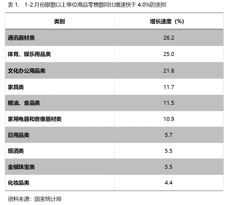1-2月份,限額以上單位商品零售額增速快于社會(huì)消費(fèi)品零售總額4.0%增速的共有10類(lèi),即通訊器材類(lèi)增長(zhǎng)26.2%,體育、娛樂(lè)用品類(lèi)增長(zhǎng)25.0%,文化辦公用品類(lèi)增長(zhǎng)21.8%,家具類(lèi)增長(zhǎng)11.7%,糧油、食品類(lèi)增長(zhǎng)11.5%,家用電器和音像器材類(lèi)增長(zhǎng)10.9%,日用品類(lèi)增長(zhǎng)5.7%,煙酒類(lèi)增長(zhǎng)5.5%,金銀珠寶類(lèi)增長(zhǎng)5.5%,化妝品類(lèi)同比增長(zhǎng)4.4%。