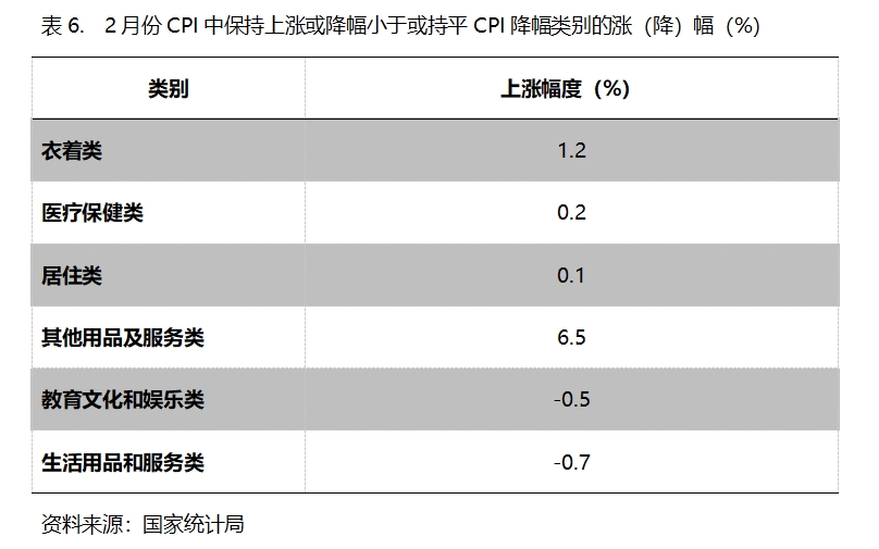 CPI中保持上漲的類(lèi)別共4類(lèi),即衣著類(lèi)價(jià)格同比上漲1.2%,醫(yī)療保健類(lèi)上漲0.2%,居住類(lèi)上漲0.1%,其他用品和服務(wù)類(lèi)上漲6.5%;降幅小于或持平CPI降幅的類(lèi)別共2類(lèi),即教育文化和娛樂(lè)類(lèi)下降0.5%,生活用品及服務(wù)下降0.7%。