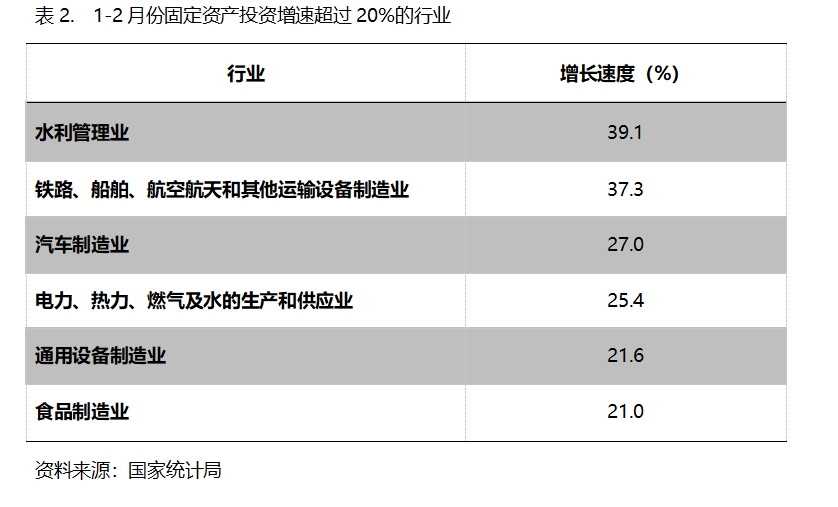 1-2月份,固定資產(chǎn)投資增速超過(guò)20%的主要行業(yè)共6個(gè),即水利管理業(yè)增長(zhǎng)39.1%,鐵路、船舶、航空航天和其他運(yùn)輸設(shè)備制造業(yè)增長(zhǎng)37.3%,汽車(chē)制造業(yè)增長(zhǎng)27.0%,電力、熱力、燃?xì)饧八纳a(chǎn)和供應(yīng)業(yè)增長(zhǎng)25.4%,通用設(shè)備制造業(yè)增長(zhǎng)21.6%,食品制造業(yè)增長(zhǎng)21.0%。
