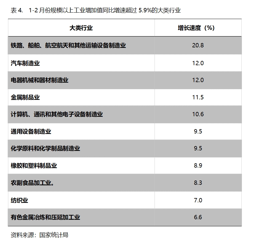 1-2月份,增長(zhǎng)速度超過(guò)規(guī)模以上工業(yè)增長(zhǎng)5.9%的主要大類(lèi)行業(yè)共有11個(gè),即鐵路、船舶、航空航天和其他運(yùn)輸設(shè)備制造業(yè)增長(zhǎng)20.8%,汽車(chē)制造業(yè)增長(zhǎng)12.0%,電器機(jī)械和器材制造業(yè)增長(zhǎng)12.0%,金屬制品業(yè)增長(zhǎng)11.5%,計(jì)算機(jī)、通訊和其他電子設(shè)備制造業(yè)增長(zhǎng)10.6%,通用設(shè)備制造業(yè)增長(zhǎng)9.5%,化學(xué)原料和化學(xué)制品制造業(yè)增長(zhǎng)9.5%,橡膠和塑料制品業(yè)增長(zhǎng)8.9%,農(nóng)副食品加工業(yè)增長(zhǎng)8.3%,紡織業(yè)增長(zhǎng)7.0%,有色金屬冶煉和壓延加工業(yè)增長(zhǎng)6.6%。