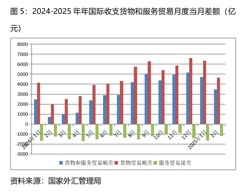 (四)國際收支貨物和服務(wù)貿(mào)易順差增加。今年1月份國際收支貨物和服務(wù)貿(mào)易順差4711億元,比上年同月的2459億元增加2252億元;2月份順差3459億元,比上年同月的724億元增加2735億元,國際收支貨物和服務(wù)貿(mào)易繼續(xù)保持多年以來順差的態(tài)勢,同時(shí)今年以來的順差比上年同期增加較多。國際收支貨物和服務(wù)順差中,貨物貿(mào)易繼續(xù)保持順差,服務(wù)貿(mào)易仍然保持逆差。1月份國際收支貨物貿(mào)易順差6342億元,服務(wù)貿(mào)易逆差1631億元;2月份國際收支貨物貿(mào)易順差4638億元,服務(wù)貿(mào)易逆差1178億元。在國際環(huán)境趨于更加復(fù)雜嚴(yán)峻形勢下,國際收支貨物和服務(wù)貿(mào)易仍實(shí)現(xiàn)較大順差,充分說明我國經(jīng)濟(jì)有著較強(qiáng)的韌性和回旋空間。