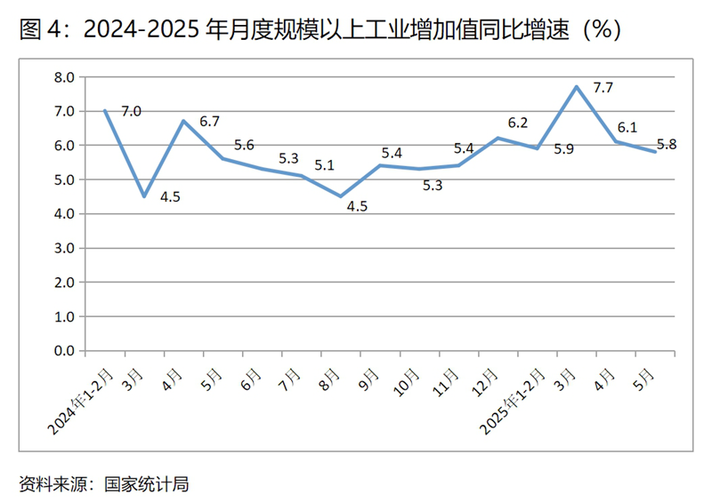 (四)工業(yè)增速持續(xù)回落。5月份,規(guī)模以上工業(yè)增加值同比增長5.8%,比上月增長6.1%回落了0.3個百分點,4月份比3月份回落了1.6個百分點,呈現(xiàn)出兩個月的連續(xù)回落。從工業(yè)三大門類看,主要是制造業(yè)增速回落。5月份采礦業(yè)同比增長5.7%,與上月持平;制造業(yè)增長6.2%,比上月回落0.4個百分點;電力、熱力、燃氣及水生產(chǎn)和供應業(yè)增長2.2%,比上月回升0.1個百分點。5月份工業(yè)增速回落幅度雖然比上月收窄不少,但還是要密切關注回落背后反映出的工業(yè)增長動力未來可能變動的趨勢。