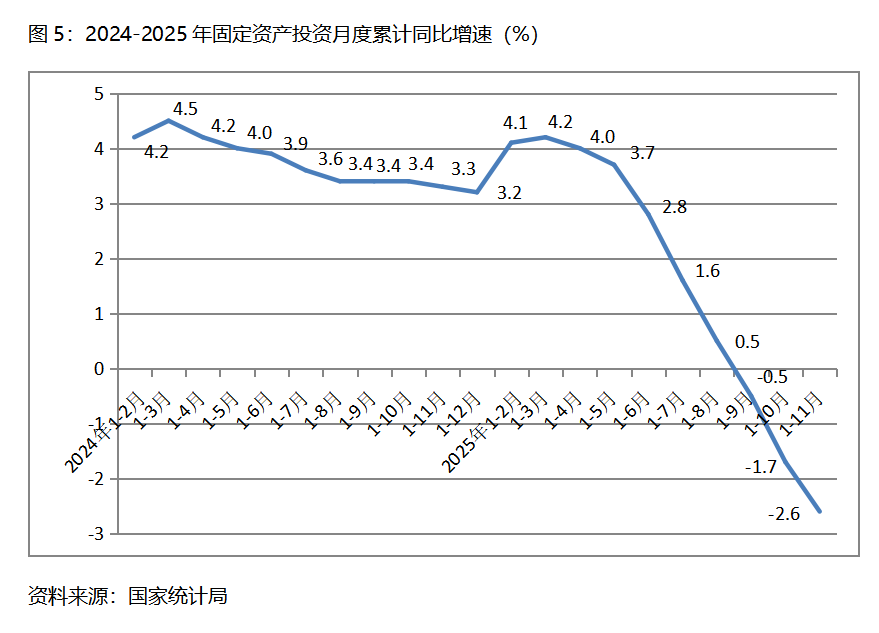 四、零售增速持續(xù)回落。11月份,社會消費品零售總額同比增長1.3%,比10月份增長2.9%回落了1.6個百分點,10月份比9月份增長3.0%回落了0.1個百分點,其中,餐飲收入和商品零售額增速均出現了回落,10月份餐飲收入同比增長3.2%,比10月份增長3.8%回落了0.6個百分點;商品零售額增長1.0%,比10月份增長2.8%回落1.8個百分點。社會消費品零售總額增速的持續(xù)回落,需要引起高度關注。