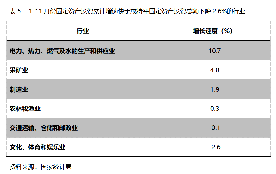 1-11月份,固定資產投資累計增速快于或持平固定資產投資總額下降2.6%的行業(yè)共6個,即電力、熱力、燃氣及水的生產和供應業(yè)增長10.7%,采礦業(yè)增長4.0%,制造業(yè)增長1.9%。農林牧漁業(yè)增長0.3%,交通運輸、倉儲和郵政業(yè)下降0.1%,文化、體育和娛樂業(yè)下降2.6%。