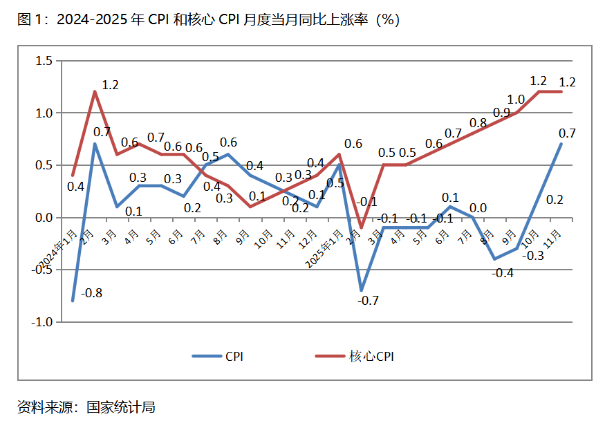 一、CPI漲幅持續(xù)回升。11月份,CPI同比上漲0.7%,比10月份上漲0.2%回升0.5個百分點,10月份由9月份下降0.3%轉為上漲;核心CPI同比上漲1.2%,與10月份上漲1.2%持平,10月份比9月份上漲1.0%回升了0.2個百分點。CPI漲幅回升較為為明顯,核心CPI漲幅保持穩(wěn)定,表明經濟運行活力繼續(xù)增強,但由于漲幅仍較為有限,加之較長時期處于偏低水平,經濟運行活力還有待進一步提高。
