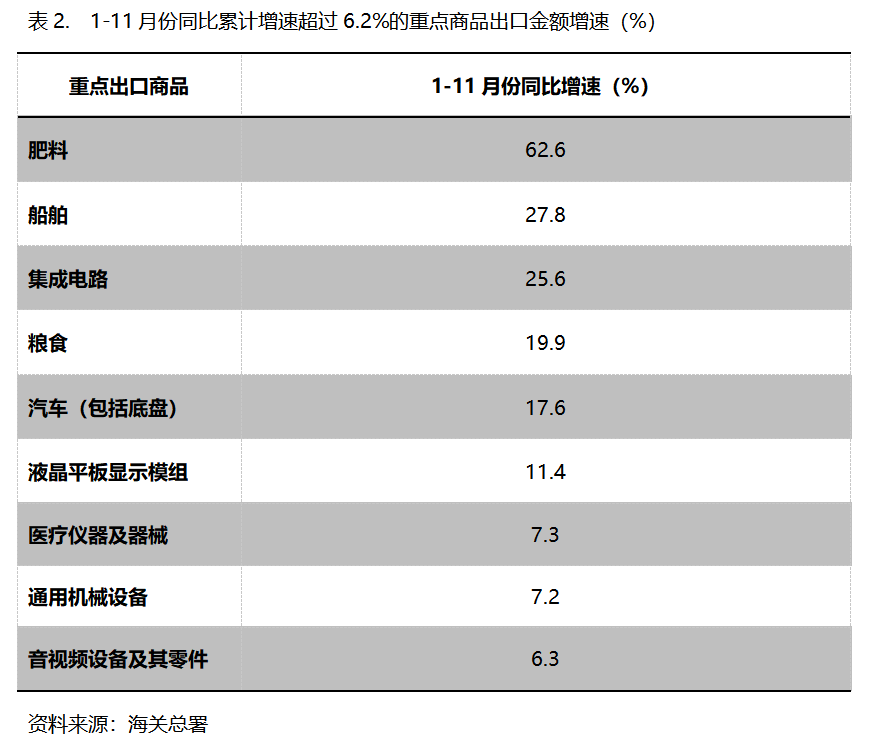 1-11月份,出口金額同比增速超過6.2%的重點商品共有9類,即肥料出口增長62.6%,船舶增長27.8%,集成電路增長25.6%,糧食增長19.9%,汽車(包括底盤)增長17.6%,液晶平板顯示模組增長11.4%,醫(yī)療儀器及器械增長7.3%,通用機器設備增長7.2%,音視頻設備及其零件增長6.3%。