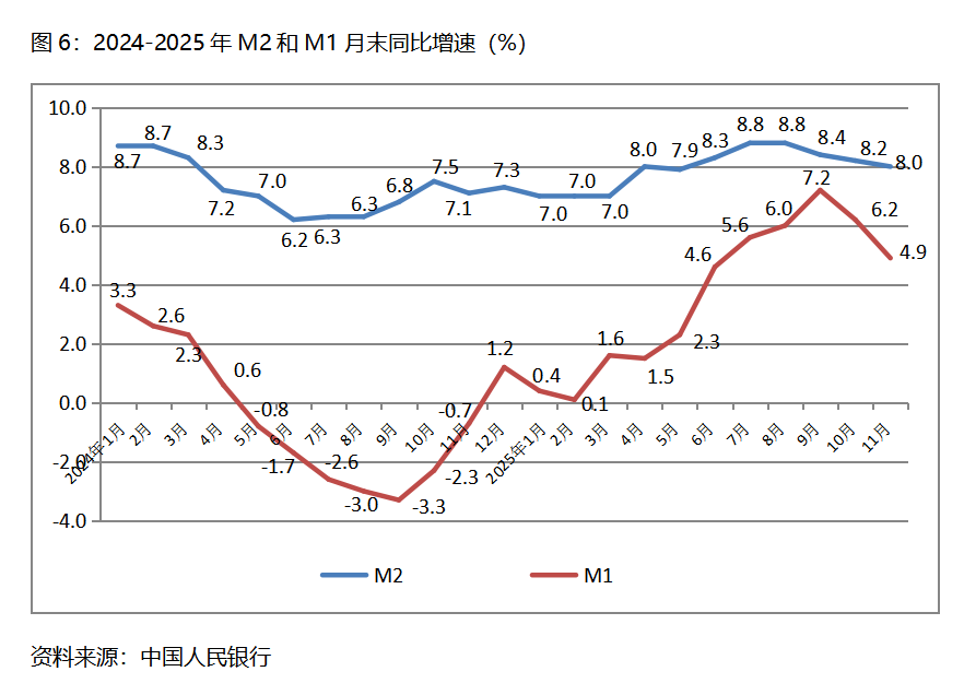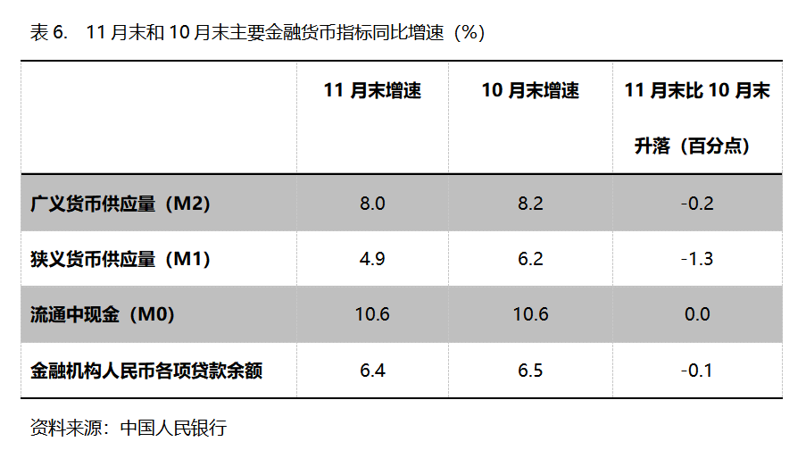 六、M2增速持續(xù)回落。11月末,廣義貨幣供應量(M2)同比增長8.0%,比10月末增長8.2%回落0.2個百分點,10月末增幅比9月末增長8.4%回落0.2個百分點;狹義貨幣供應量(M1)同比增長4.9%,比10月末增長6.2%回落1.3個百分點,10月末增幅比9月末增長7.2%回落1.0個百分點;流通中貨幣(M0)同比增長10.6%,與10月末增長10.6%持平,10月末增幅比9月末增長11.5%回落0.9個百分點。11月份末,M2增速已連續(xù)3個月回落,M1增速已連續(xù)2個月回落,M0由回落轉為持平。