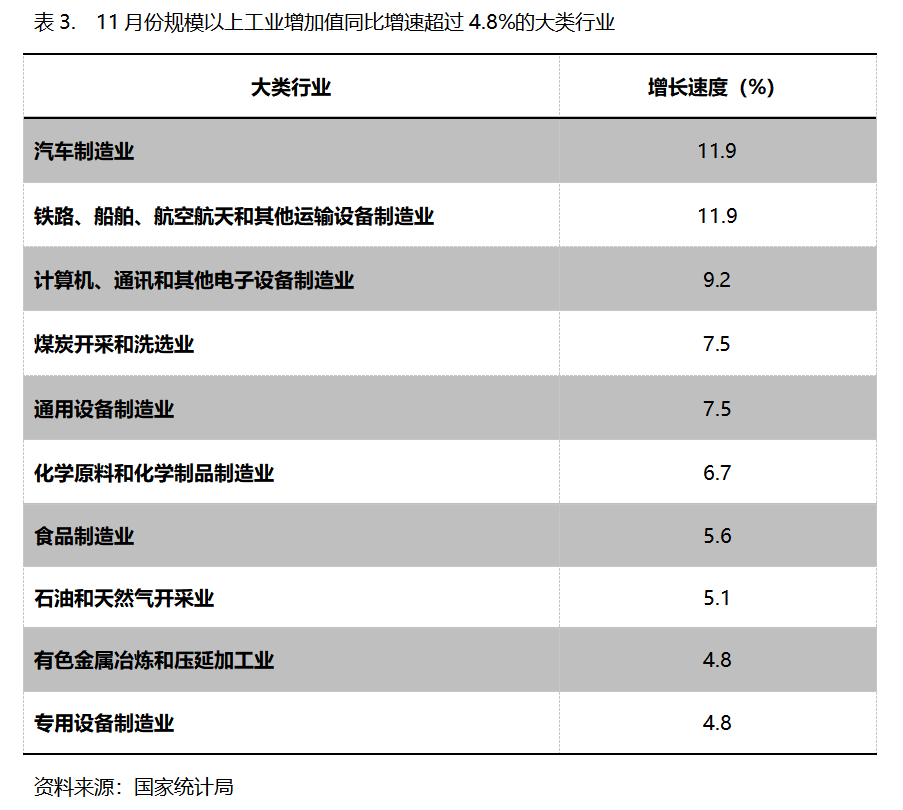 11月份,增長速度超過或持平規(guī)模以上工業(yè)增長4.8%的主要大類行業(yè)共有10個,即汽車制造業(yè)同比增長11.9%,鐵路、船舶、航空航天和其他運輸設備制造業(yè)增長11.9%,計算機、通訊和其他電子設備制造業(yè)增長9.2%,煤炭開采和洗選業(yè)增長7.5%,通用設備制造業(yè)增長7.5%,化學原料和化學制品制造業(yè)增長6.7%,食品制造業(yè)增長5.6%,石油和天然氣開采業(yè)增長5.1%,有色金屬冶煉和壓延加工業(yè)增長4.8%,專用設備制造業(yè)增長4.8%。