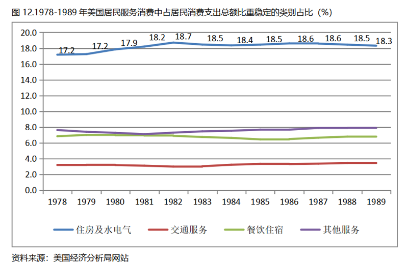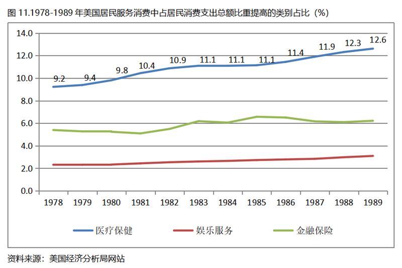 由于數(shù)據(jù)來源的原因,重點將看一下美國居民服務(wù)消費類別在人均GDP超過1萬美元后的變化情況。美國居民服務(wù)消費共有7個大類別,在1978-1989年期間占居民消費支出總額比重提高的有3個類別,分別是醫(yī)療保健、娛樂服務(wù)和金融保險,醫(yī)療保健占居民消費支出總額的比重提高了3.4個百分點,娛樂服務(wù)和金融保險占居民消費支出總額的比重均提高了0.8個百分點。