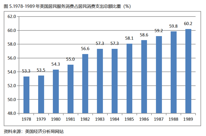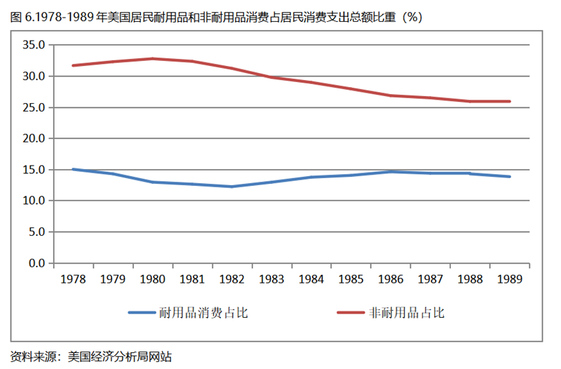 美國在人均GDP超過1萬美元后的1978-1989年期間,居民服務(wù)消費占居民消費支出總額持續(xù)提高,而居民耐用品消費占居民消費支出總額比重、非耐用品消費占居民消費支出總額比重均呈現(xiàn)下降趨勢。
