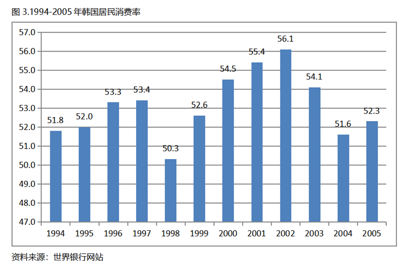 韓國是1994年人均GDP超過1萬美元的,在1994-2005年的12年期間,居民消費率也呈現(xiàn)先升后落的走勢,總體上看是在高位上保持著較為穩(wěn)定的態(tài)勢,2005年比1994升0.5個百分點。