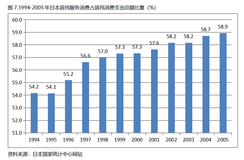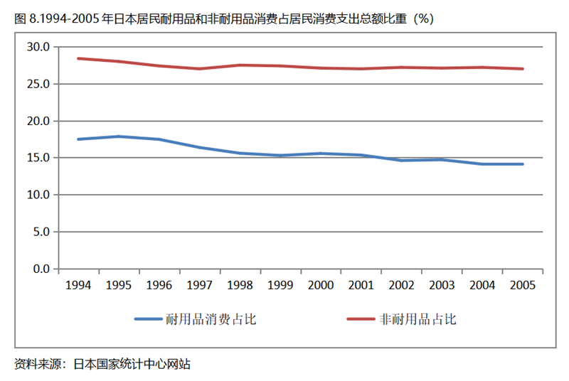 日本在人均GDP超過1萬美元后的1994-2005年期間,居民服務(wù)消費占居民消費支出總額持續(xù)提高,而居民耐用品消費占居民消費支出總額比重、非耐用品消費占居民消費支出總額比重均呈現(xiàn)下降趨勢。