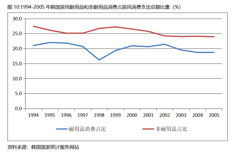 韓國在人均GDP超過1萬美元后的1994-2005年期間,居民服務(wù)消費占居民消費支出總額在波動中提高,而居民耐用品消費占居民消費支出總額比重、非耐用品消費占居民消費支出總額比重要均呈現(xiàn)下降趨勢。
