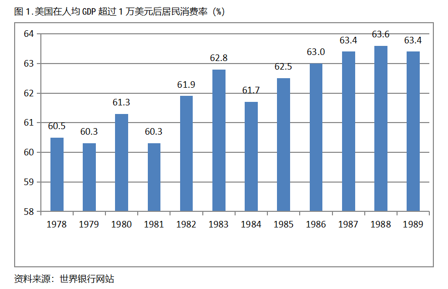 美國在人均GDP超過1萬美元后的12年期間注,居民消費率一直保持在60.0%以上,同時還呈現(xiàn)出總體持續(xù)提高的趨勢。美國在1978年人均GDP超過1萬美元,當年居民消費率為60.5%,此后總體保持了持續(xù)提高的態(tài)勢,12年后的1989年提高到63.4%,提高了2.9個百分點。
