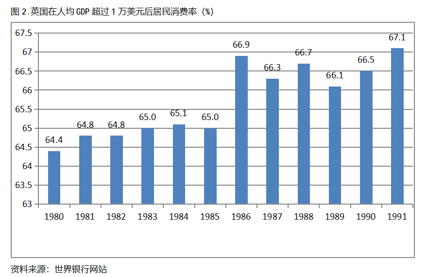一、美國和英國在人均GDP超過1萬美元后的12年期間,居民消費率總體保持持續(xù)提高、提高幅度近3.0個百分點。