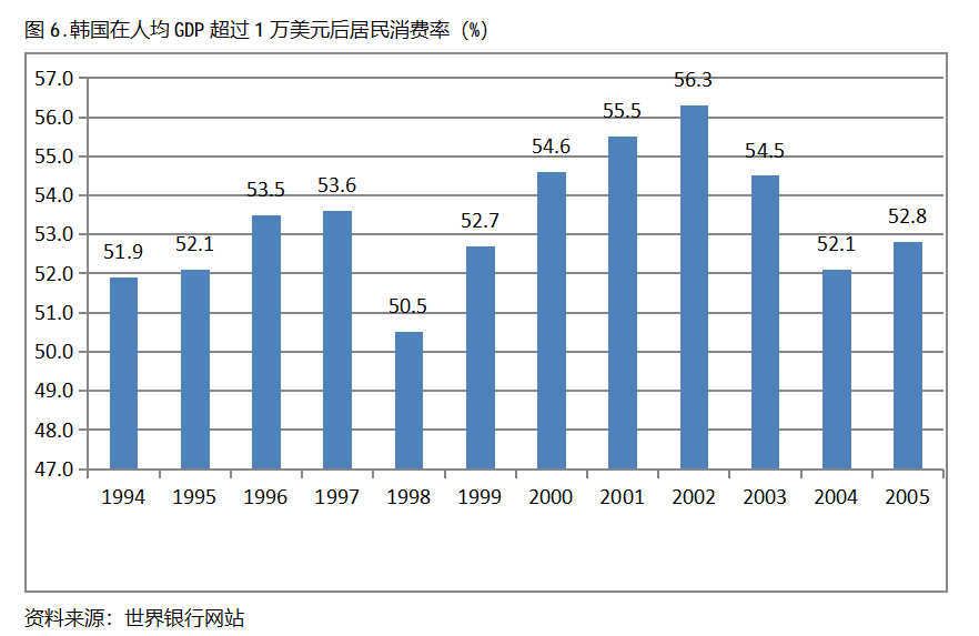 韓國在人均GDP超過1萬美元后的12年期間,居民消費率一直保持在50.0%以上,呈現(xiàn)出較長時間的提高,但后幾年出現(xiàn)小幅的回落。韓國在1994年人均GDP超過1萬美元,當年居民消費率為51.9%,2002提高到56.3%,隨后出現(xiàn)回落,2005年為52.8%,也就是說,韓國在人均GDP超過1萬美元后的12年期間,居民消費率由當年的51.9%提高到2002年最高的56.3%,共提高了4.4個百分點。