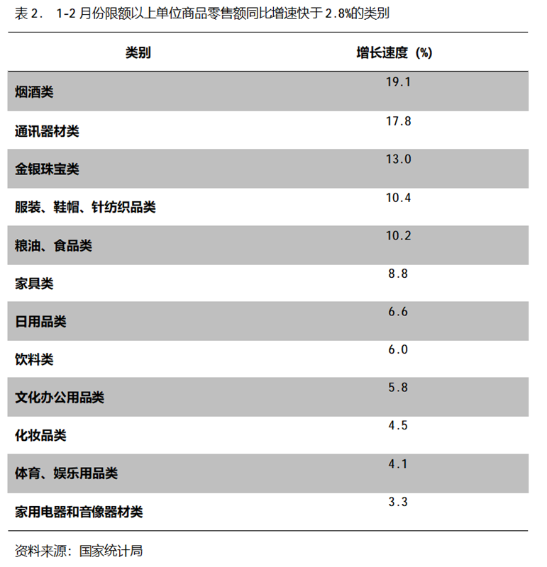 1-2月份,限額以上單位商品零售額同比增速快于社會(huì)消費(fèi)品零售總額2.8%增速的共有12類,即煙酒類增長19.1%,通訊器材類增長17.8%,金銀珠寶類增長13.0%,服裝、鞋帽、針紡織品類增長10.4%,糧油、食品類增長10.2%,家具類增長8.8%,日用品類增長6.6%,飲料類增長6.0%,文化辦公用品類增長5.8%,化妝品類增長4.5%,體育、娛樂類增長4.1%,家用電器和音像類增長3.3%。