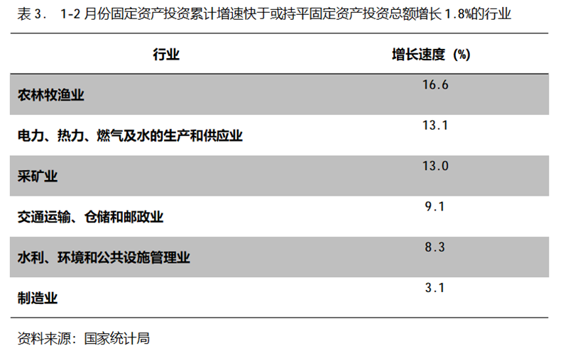 1-2月份,固定資產(chǎn)投資累計(jì)增速快于或持平固定資產(chǎn)投資總額增長1.8%的行業(yè)共6個(gè),即農(nóng)林牧漁業(yè)增長16.6%,電力、熱力、燃?xì)饧八纳a(chǎn)和供應(yīng)業(yè)增長13.1%,采礦業(yè)增長13.0%,交通運(yùn)輸、倉儲(chǔ)和郵政業(yè)增長9.1%,水利、環(huán)境和公共設(shè)施管理業(yè)增長8.3%,制造業(yè)增長3.1%。