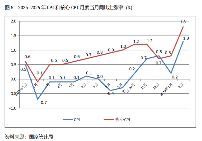 五、CPI漲幅由落轉(zhuǎn)升。2月份,CPI同比上漲1.3%,比1月份上漲0.2%回升了1.1個(gè)百分點(diǎn),1月份漲幅比上年12月份回落0.6個(gè)百分點(diǎn);核心CPI同比上漲1.8%,比1月份上漲0.8%回升1.0個(gè)百分點(diǎn),1月份漲幅比上年12月份回升0.1個(gè)百分點(diǎn)。由于上年2月份CPI下降0.7%、基數(shù)較低,今年和上年2月份CPI兩年平均僅上漲0.3%,CPI漲幅是否將走出低速運(yùn)行的態(tài)勢(shì),還有待進(jìn)一步的觀察。