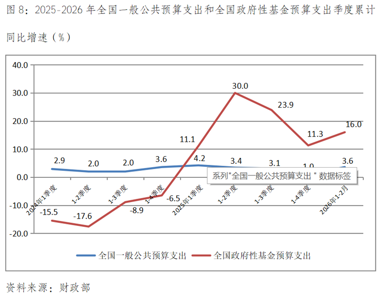 (四)一般公共預(yù)算支出和政府性基金預(yù)算支出增速均比上年全年回升,比上年同期有落有升。1-2月份全國一般公共預(yù)算支出同比增長3.6%,比上年全年增長1.0%回升2.6個(gè)百分點(diǎn),比上年同期增長4.2%回落了0.6個(gè)百分點(diǎn);全國政府性基金預(yù)算支出同比增長16.0%,比上年全年增長11.3%回升5.7個(gè)百分點(diǎn),比上年同期增長11.1%回升了5.9個(gè)百分點(diǎn)。需要關(guān)注的是1-2月份一般公共預(yù)算支出增速低于全年預(yù)算4.4%的增速,存在著加快一般公共預(yù)算支出進(jìn)度的需要。