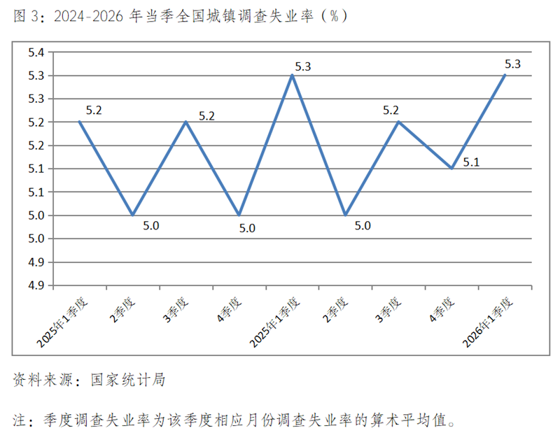 (三)調(diào)查失業(yè)率比上年四季度回升,與上年同期持平。一季度平均調(diào)查失業(yè)率為5.3%,比上年四季度的5.1%回升0.2個(gè)百分點(diǎn);與上年同期的5.3%持平,其中1月份為5.2%,2月份為5.3%,3月份為5.4%,總體上保持了基本穩(wěn)定的態(tài)勢。