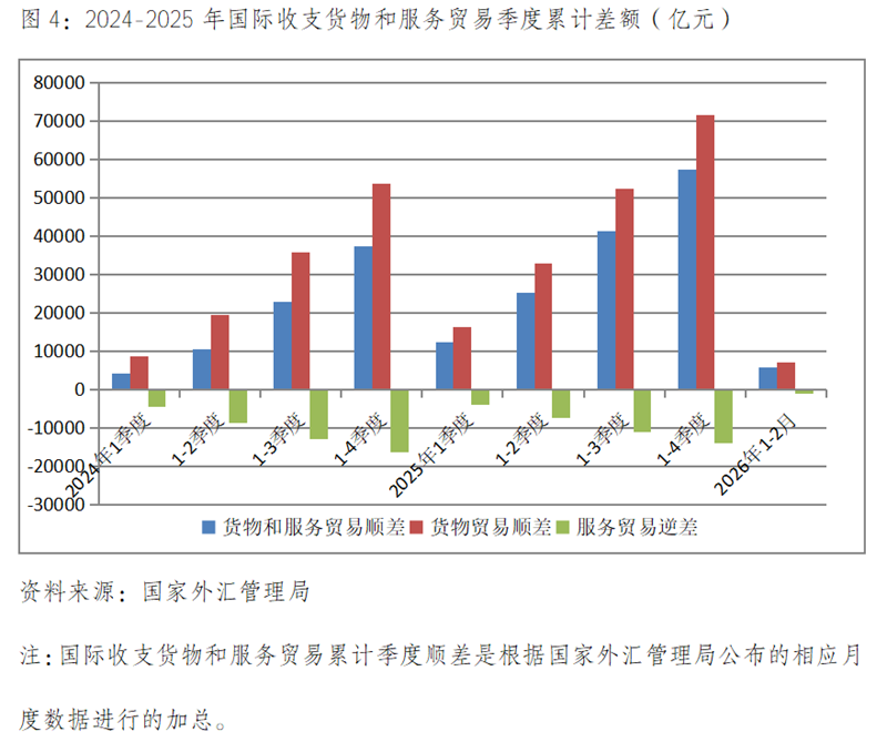 國際收支貨物和服務(wù)順差中,貨物貿(mào)易繼續(xù)保持順差,服務(wù)貿(mào)易仍然保持逆差。1月份國際收支貨物貿(mào)易順差6342億元,服務(wù)貿(mào)易逆差1631億元;2月份國際收支貨物貿(mào)易順差4638億元,服務(wù)貿(mào)易逆差1178億元。在國際環(huán)境趨于更加復(fù)雜嚴(yán)峻形勢下,國際收支貨物和服務(wù)貿(mào)易仍實(shí)現(xiàn)較大順差,充分說明我國經(jīng)濟(jì)有著較強(qiáng)的韌性和回旋空間。