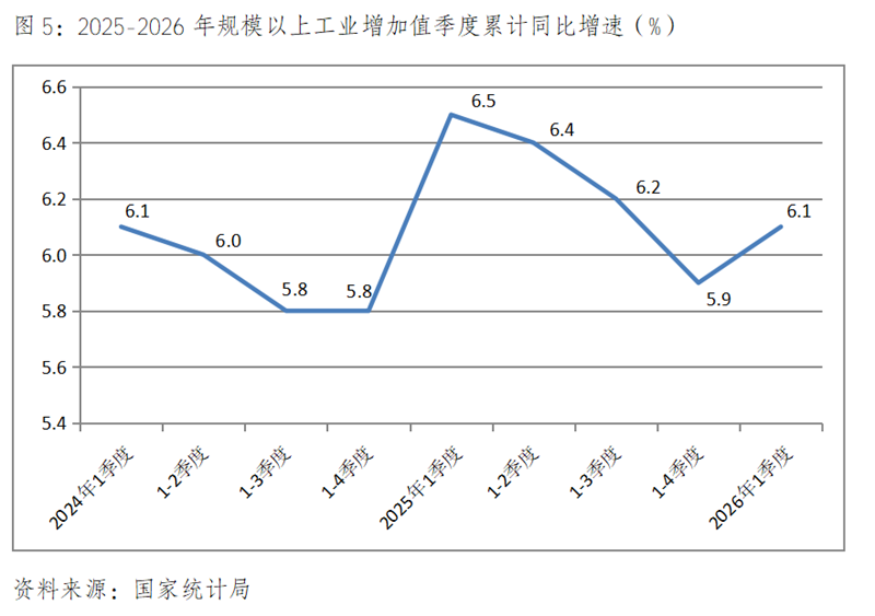 (一)工業(yè)生產(chǎn)增速比上年全年回升,比上年同期回落。一季度規(guī)模以上工業(yè)增加值同比增長6.1%,比上年全年增長5.9%回升0.2個(gè)百分點(diǎn),比上年同期增長6.5%回落0.4個(gè)百分點(diǎn)。與上年同期相比,一季度采礦業(yè)同比增長6.0%。比上年同期增長6.2%回落0.2個(gè)百分點(diǎn);制造業(yè)增長6.4%,比上年同期增長7.1%回落了0.7個(gè)百分點(diǎn);電力、熱力、燃?xì)饧八a(chǎn)和供應(yīng)增長4.3%,比上年同期增長1.9%回升了2.4個(gè)百分點(diǎn)。