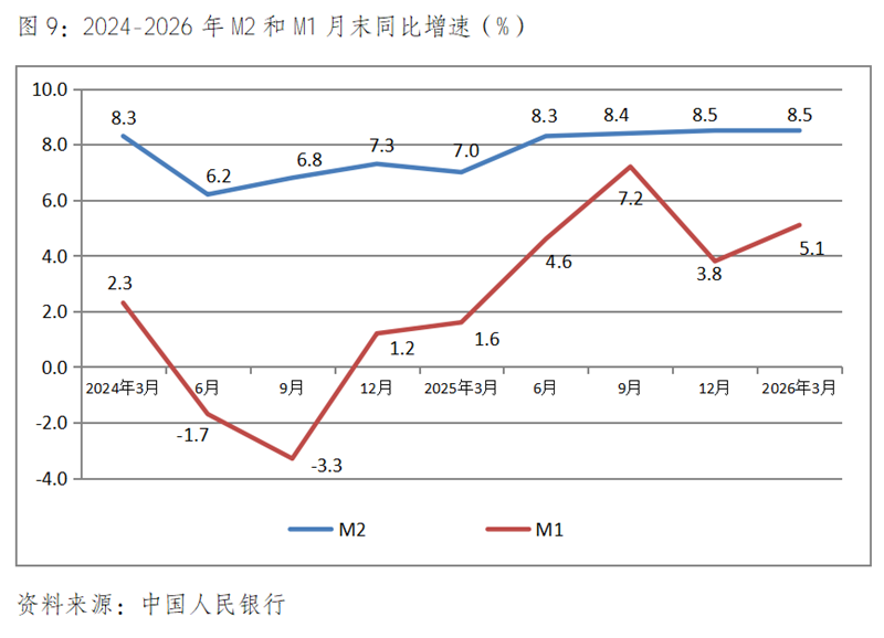 (五)廣義貨幣供應(yīng)量(M2)增速與上年年底持平,比上年同期回升。3月末,廣義貨幣供應(yīng)量同比增長8.5%,與上年年底增長8.5%持平,比上年同期增長7.0%回升1.5個(gè)百分點(diǎn);3月末,狹義貨幣供應(yīng)量同比增長5.1%,比上年年底增長3.8%回升了1.3個(gè)百分點(diǎn),比上年同期增長1.6%回升3.5個(gè)百分點(diǎn)。但M1增速比M2增速慢的點(diǎn)數(shù),雖然比上年年底和上年同期有所縮小,但3月末仍差3.4個(gè)百分點(diǎn),同時(shí)3月末金融機(jī)構(gòu)人民幣貸款余額同比增長5.7%,比存款余額同比增長8.6%慢不少,慢2.9個(gè)百分點(diǎn)。