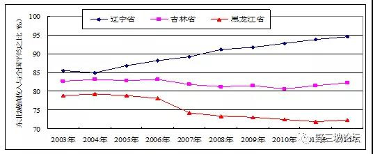 我們可以看看,從2003年到2012年這十年,實際上東北很多問題并沒有真正解決,比如投資率、消費率比嚴重扭曲,東北比全國要嚴重的多。三省投資率由2003年的37.3%上升至2011年的63.1%,提高了25.8個百分點,而同期全國由41%增長到48.3%,提高了7.3個百分點;消費率由53.2%下降至43.2%,降低10個百分點,而同期全國由56.9%下降至49.1%,降低7.8個百分點。全國的投資率已經過高了,東北的投資消費比例更加扭曲。