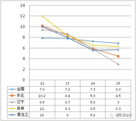 另外有一個數字,我希望經濟學家們進一步分析。近兩年東北居民消費水平增長率和東北的GDP下降是反向的。遼寧是“斷崖式”的GDP下降,但居民消費增長率2012年-2015年一直高于全國平均水平。