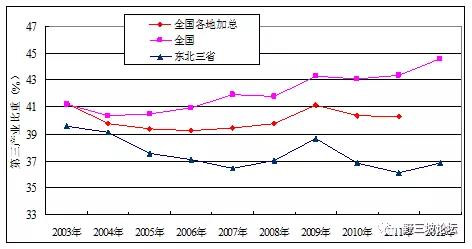 2003年到2012年,第三產業(yè)的比重與全國相比,東北地區(qū)差距進一步拉大。